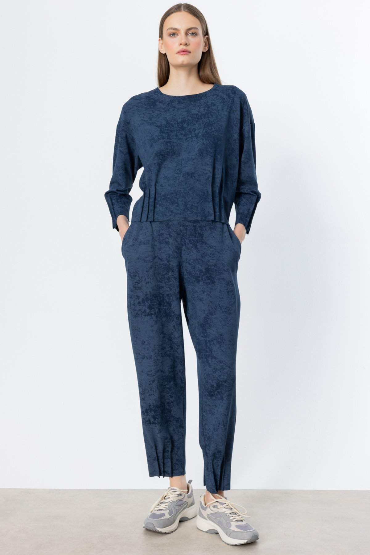 On Paçası Pileli Batik Desenli Pantolon
