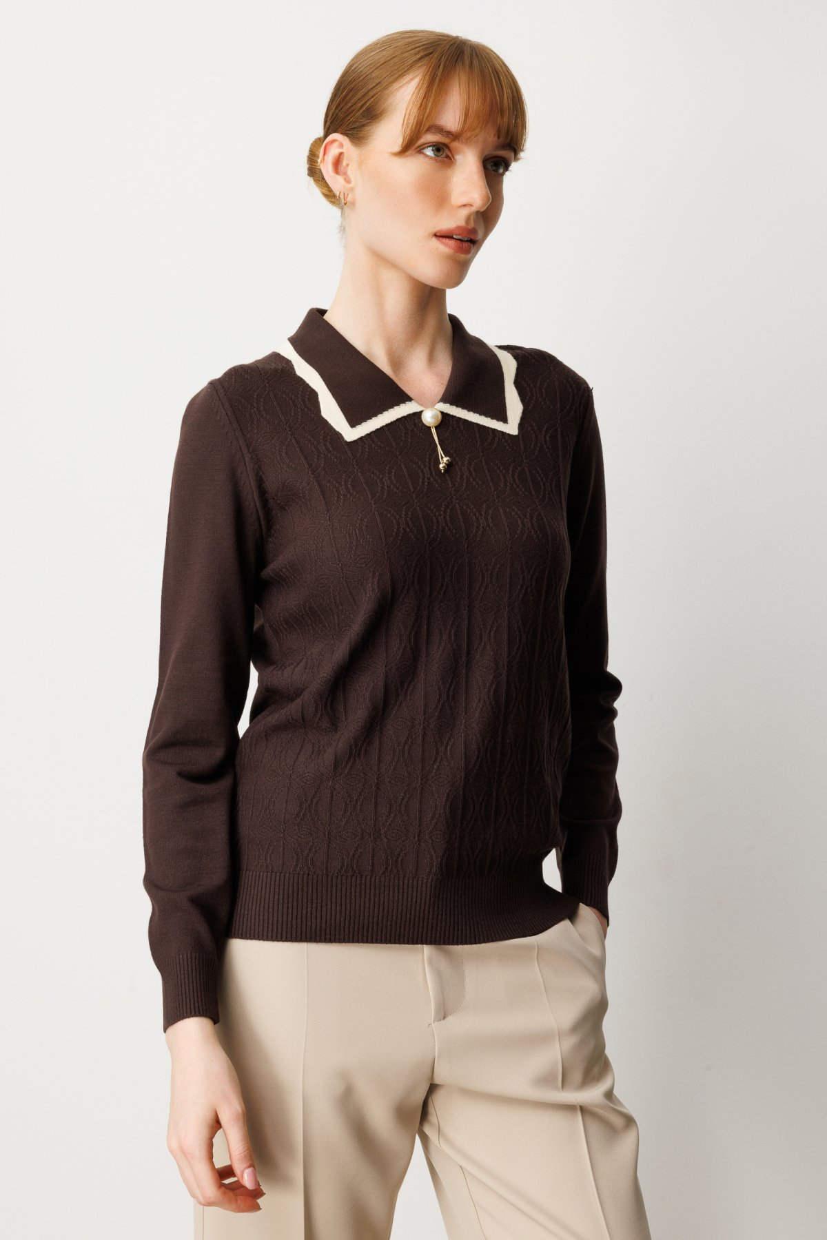 On Yakası Aksesuar Detaylı Triko Kazak On