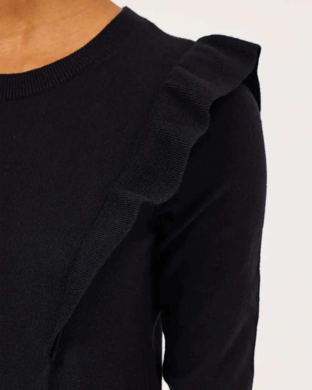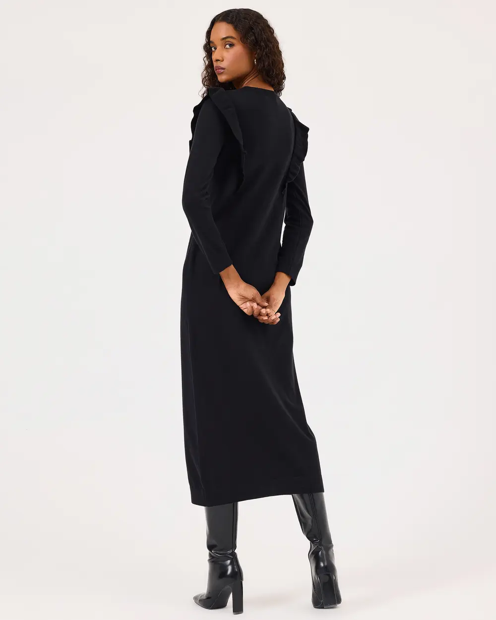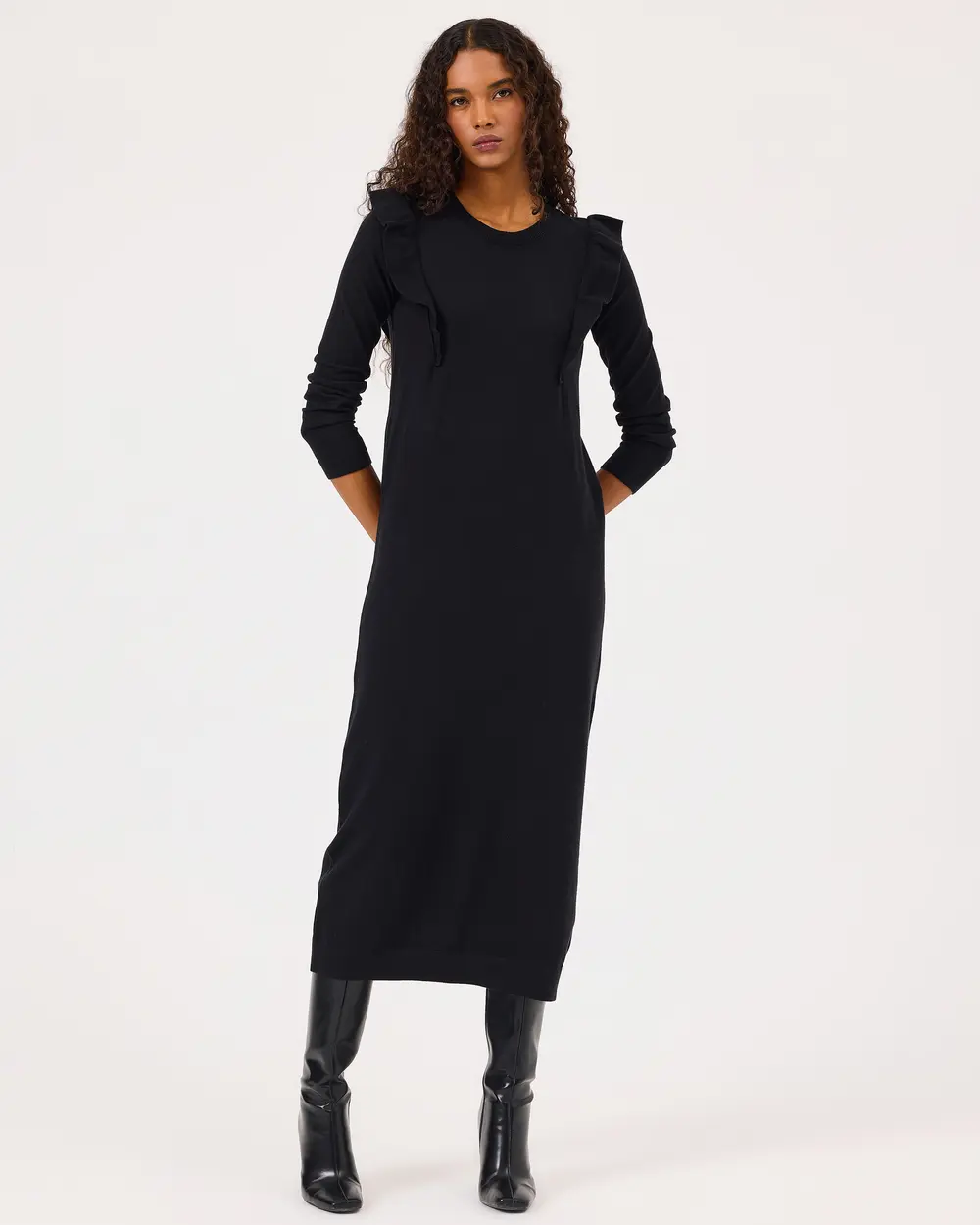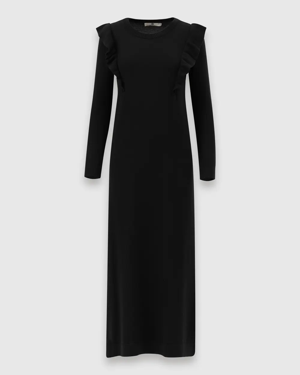 Fırfır Detaylı Uzun Kollu Triko Elbise, şık fırfır detaylarıyla öne çıkar. Kemer ile kombinlenerek vücut hatlarınızı vurgulayan şık bir görünüm sunar.