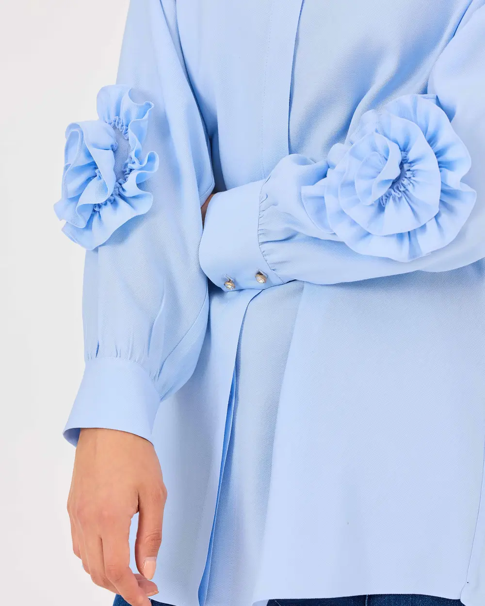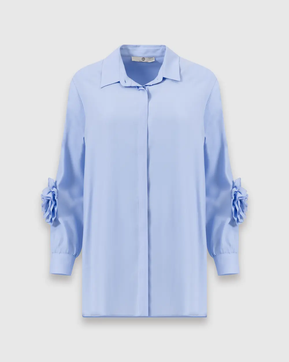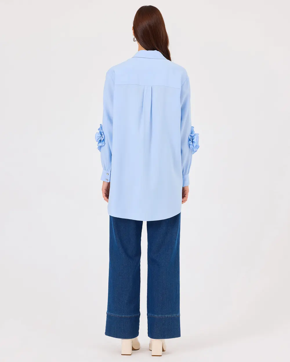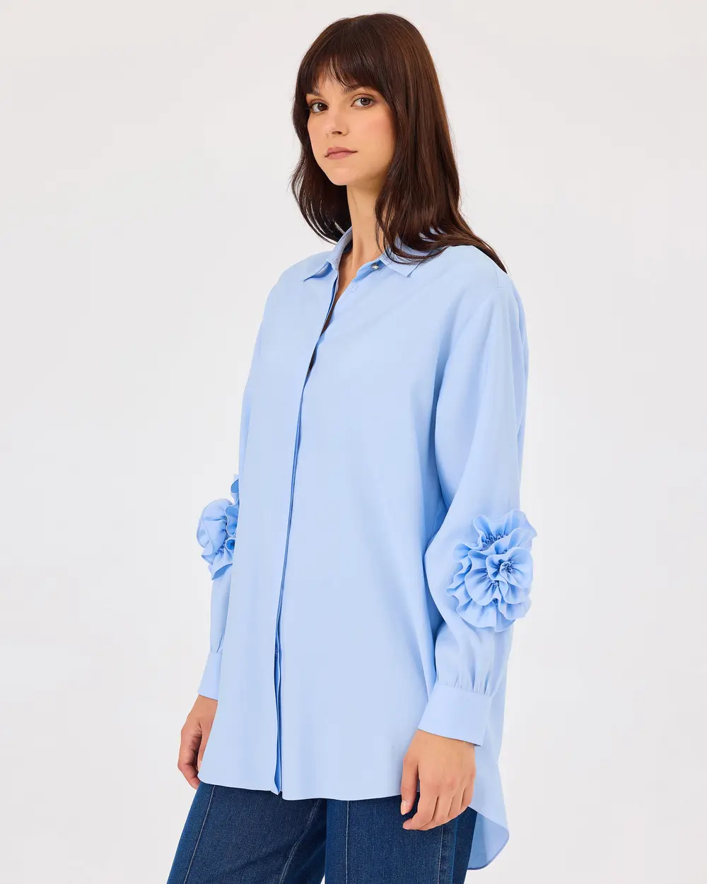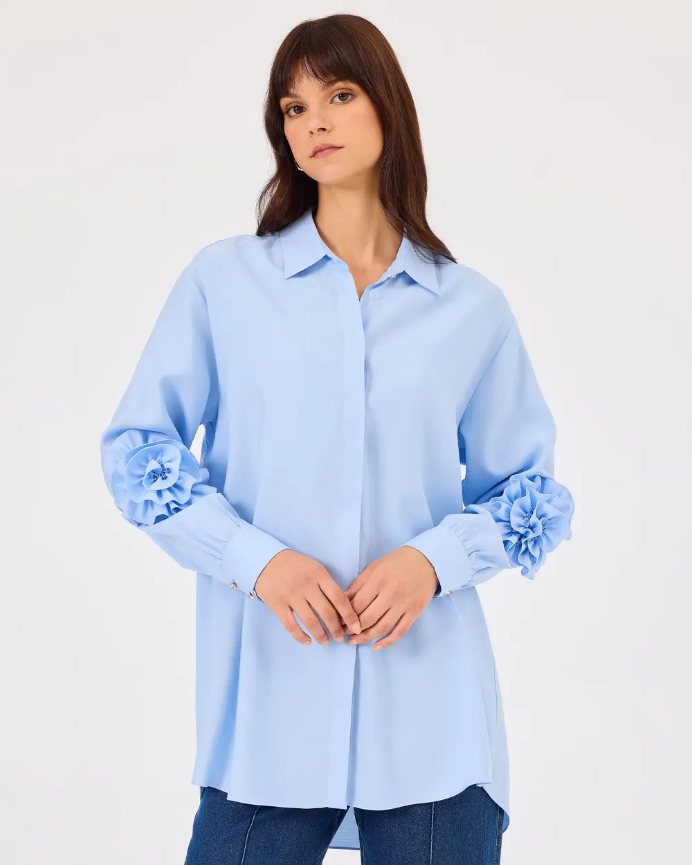 Aksesuarlı Düğmeli Gömlek, kolundaki büyük gül detayıyla dikkat çeker. Şık tasarımı ve düğme detayları, her kombinde zarif bir görünüm sunar. Hem rahat hem de stil sahibi bir tercih!