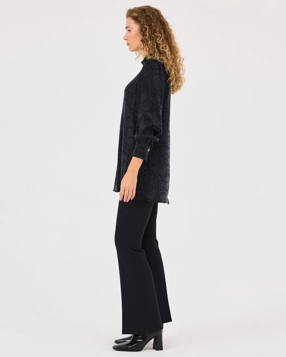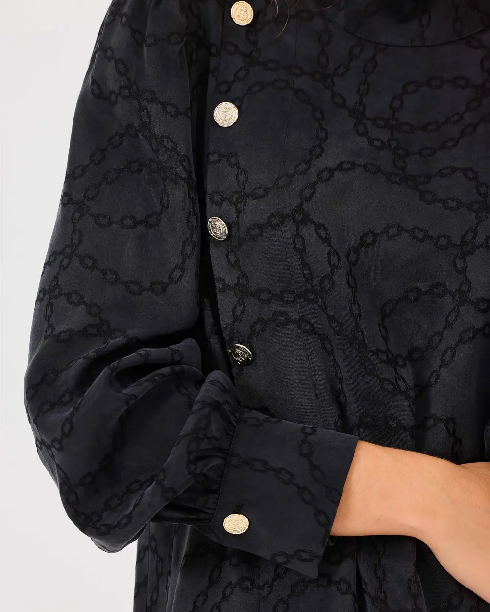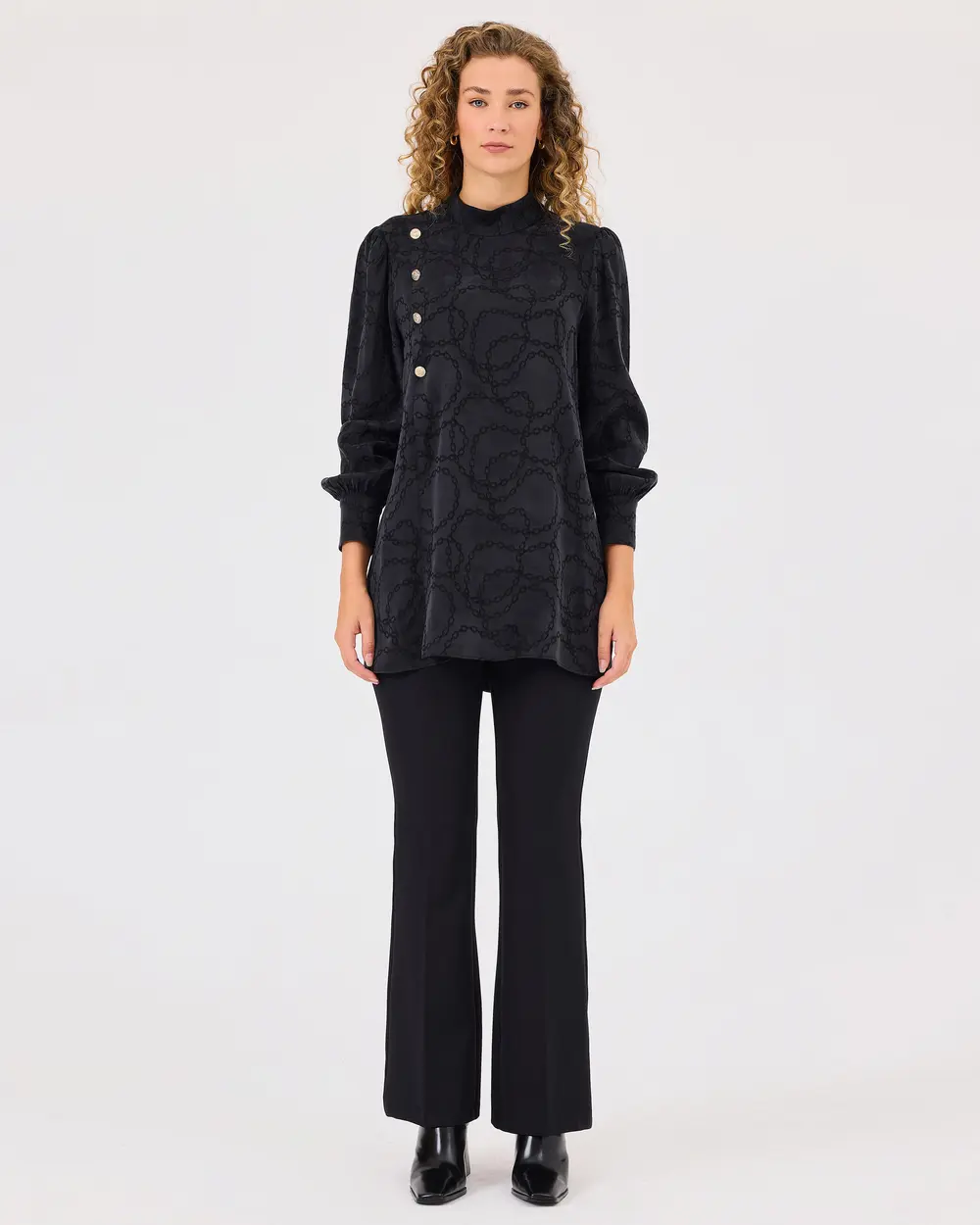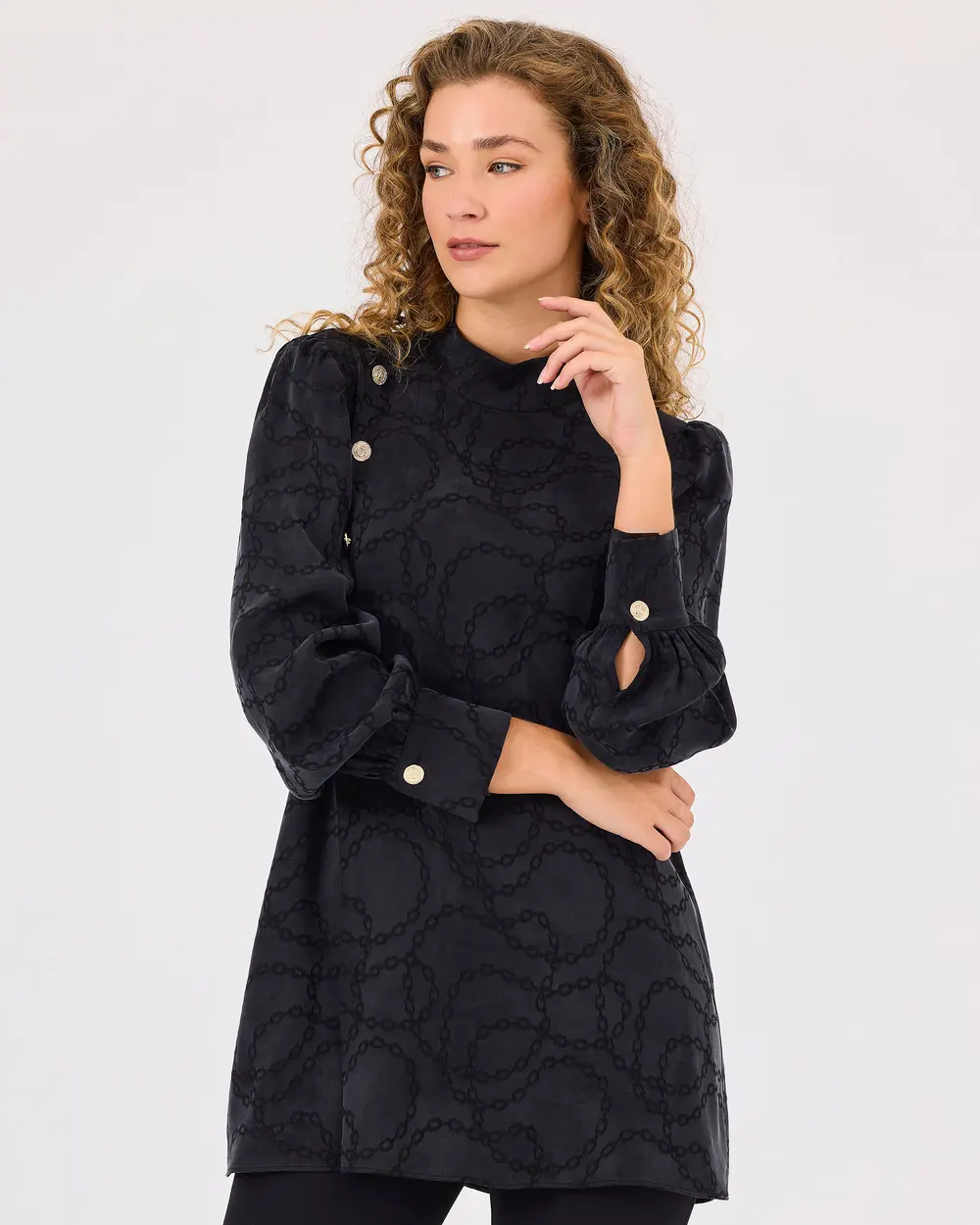 Dik Yaka Desenli Düğme Detaylı Tunik, şık zincir deseniyle göz alıcı bir stil sunar. Zarif düğme detaylarıyla birleşen modern tasarımı, her ortamda şıklığınızı vurgular.