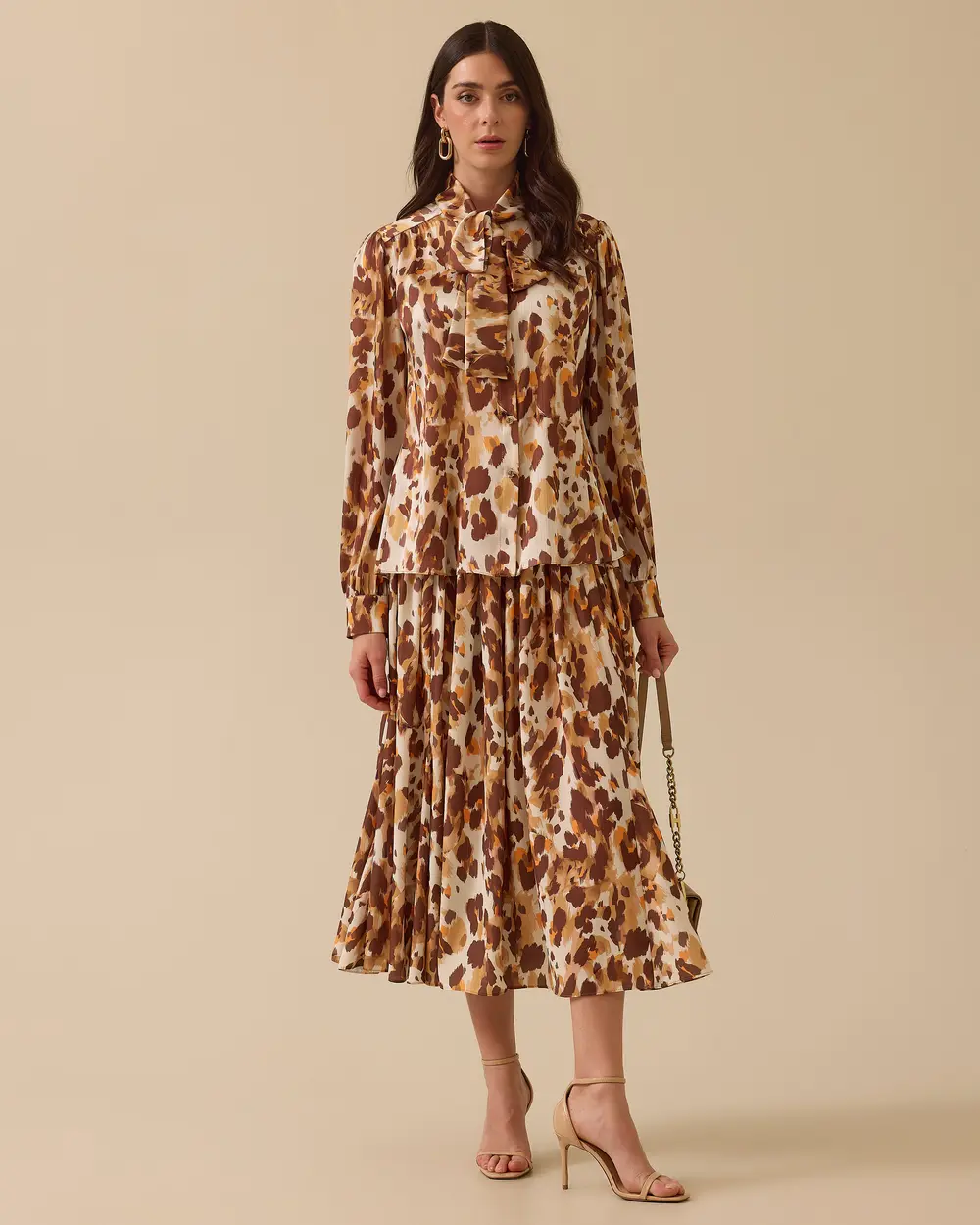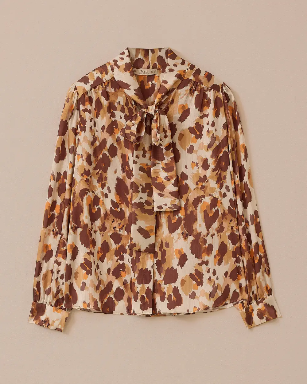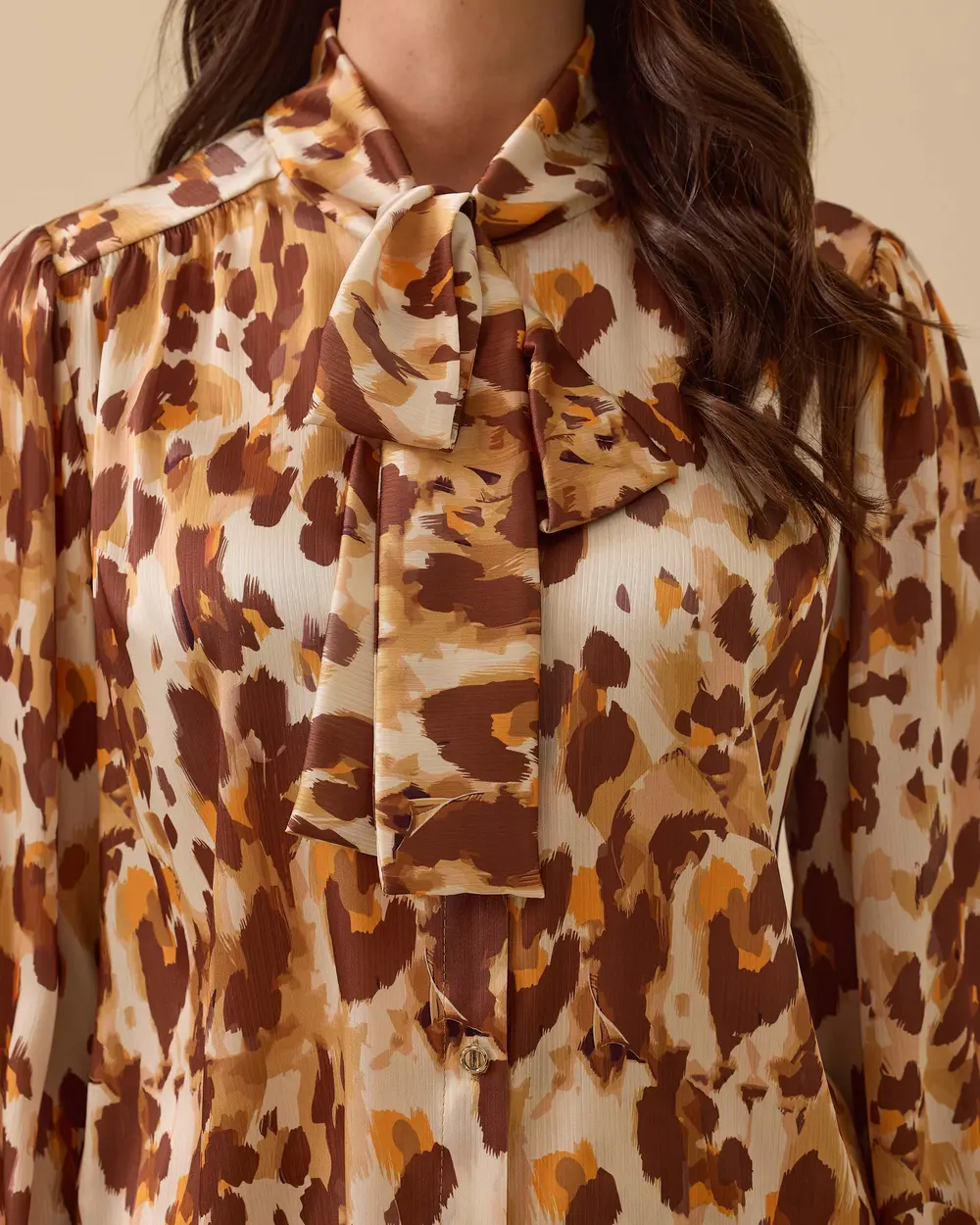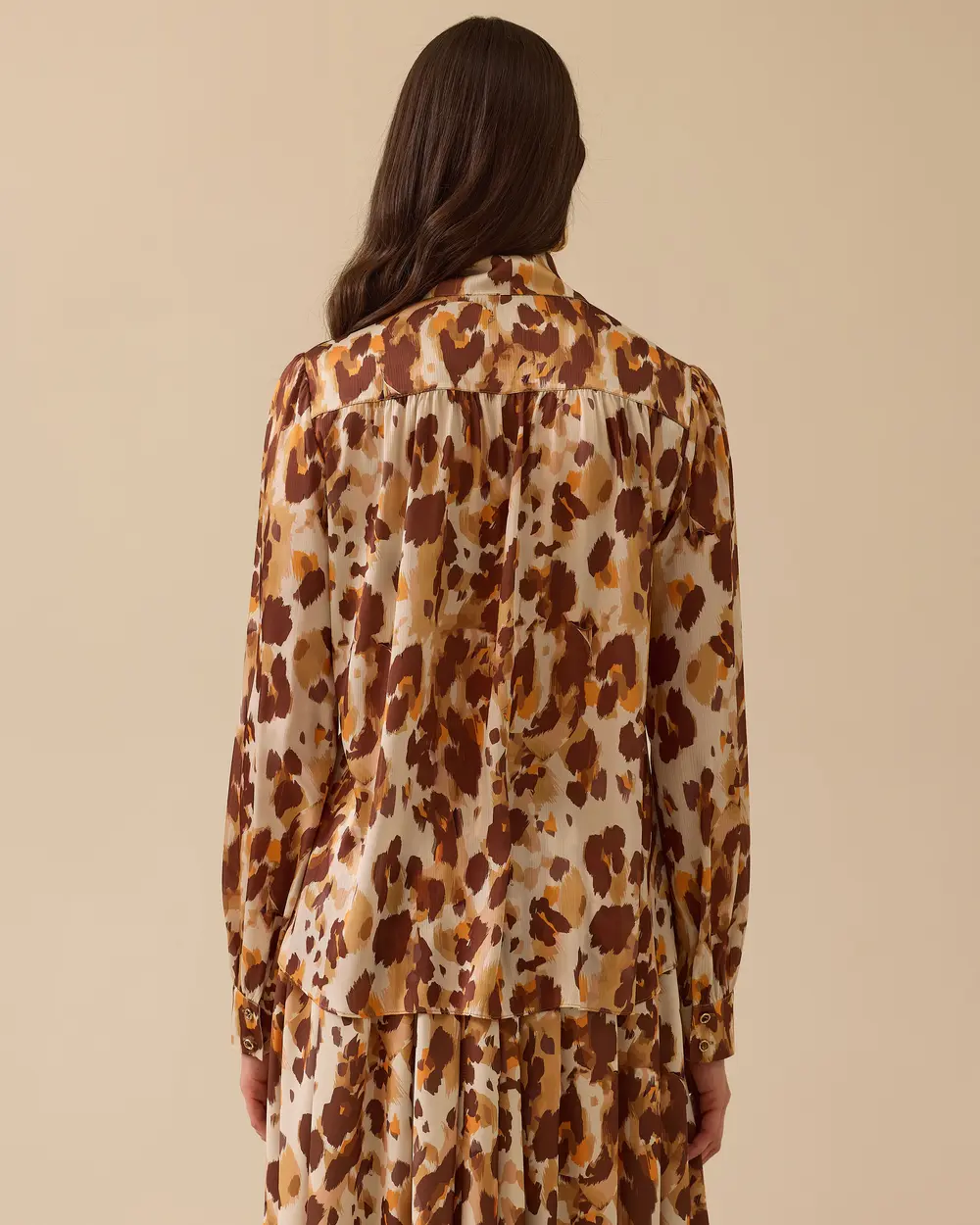 Fular Yaka Leopar Desenli Gömlek, akışkan dokusu, zarif fular yaka detayı ve çarpıcı desenleriyle kombinlerinize şık ve modern bir hava katıyor.