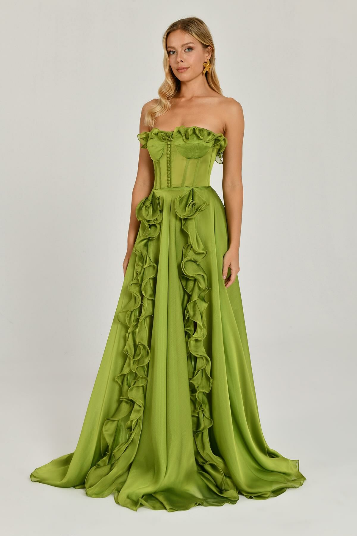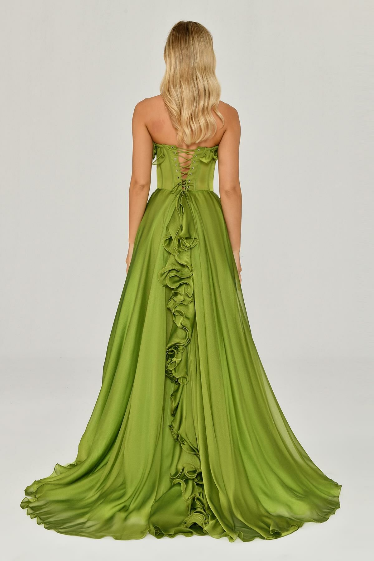 Straplez Fırfırlı Çift Yırtmaçlı Şifon Uzun Abiye Elbise Alfabeta