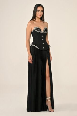 Straplez Taşlı Üst Krep Eteği Saten Pileli Uzun Abiye Elbise Alfabeta
