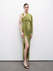 Ürün Açıklaması: Regular fit, tam kalıp, astarsız, garnisiz, asimetrik yaka, fermuarsız,yandan yırtmaçlı, drapeli takıp çıkarılabilir metal toka detaylı, tek kol maxi boy elbise