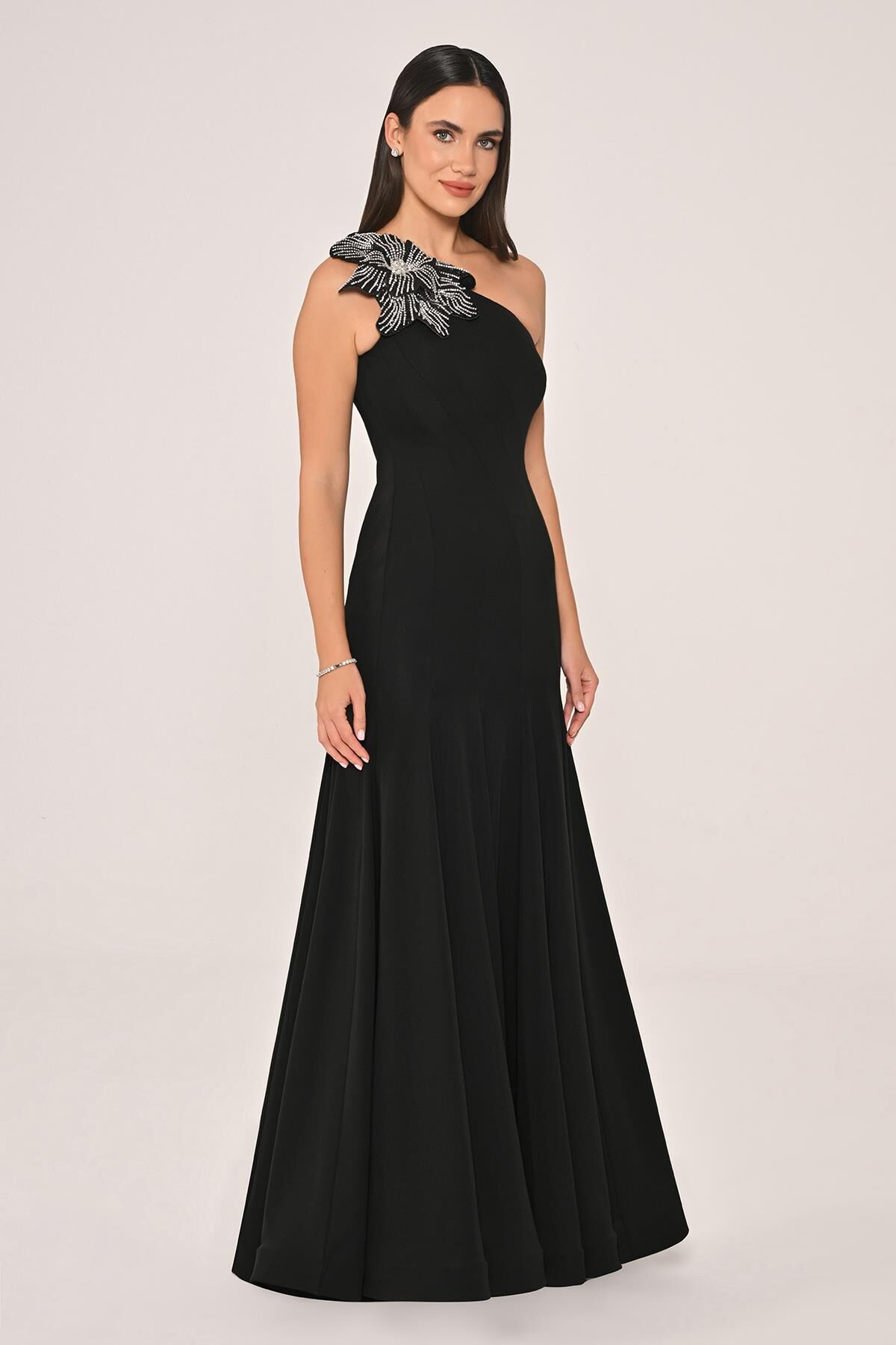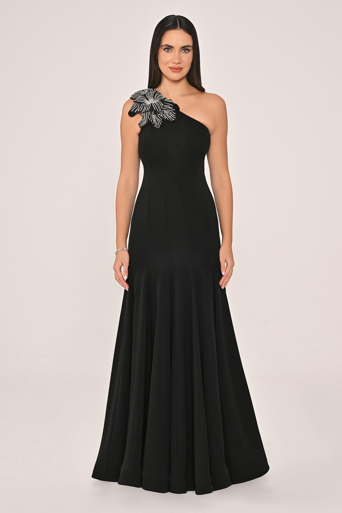 Tek Omuz Çiçek Aksesuarlı Krep Uzun Abiye Elbise Alfa Beta