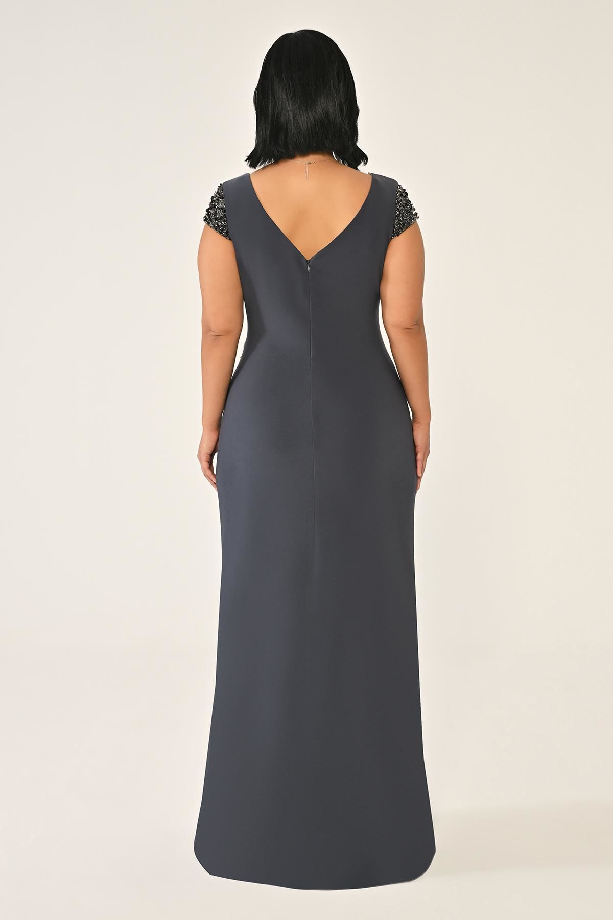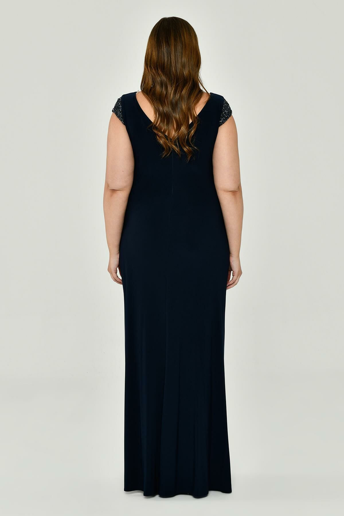 V Yaka Kısa Kollu Aksesuarlı Yırtmaçlı Uzun Abiye Elbise Alfabeta